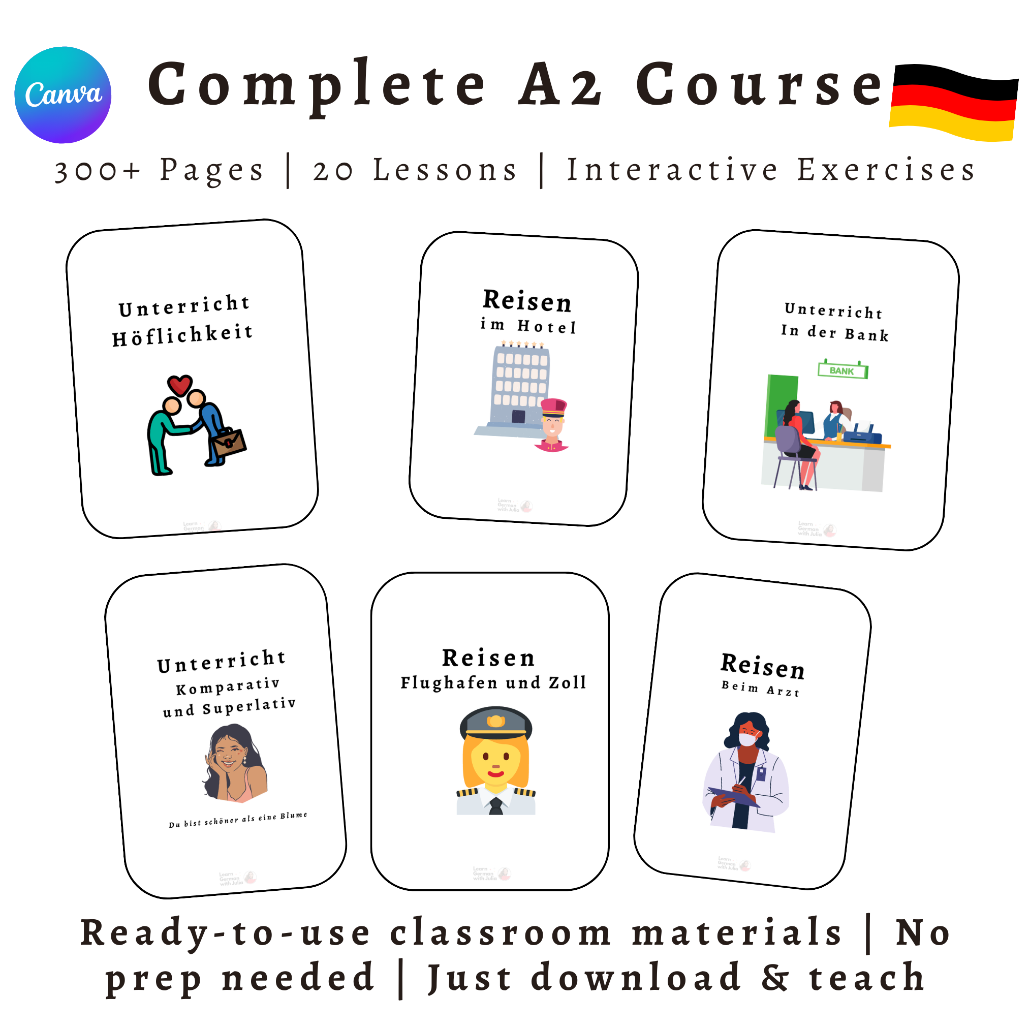 Stop spending your Sunday nights piecing together random A2 worksheets. This is what I actually use in my NYC classroom: 20 complete A2 lessons with speaking warm-ups, interactive practice, homework assignments, and answer keys. Zero prep time. Real-life German your students will actually use (travel, daily situations, problem-solving). Download and teach tomorrow.